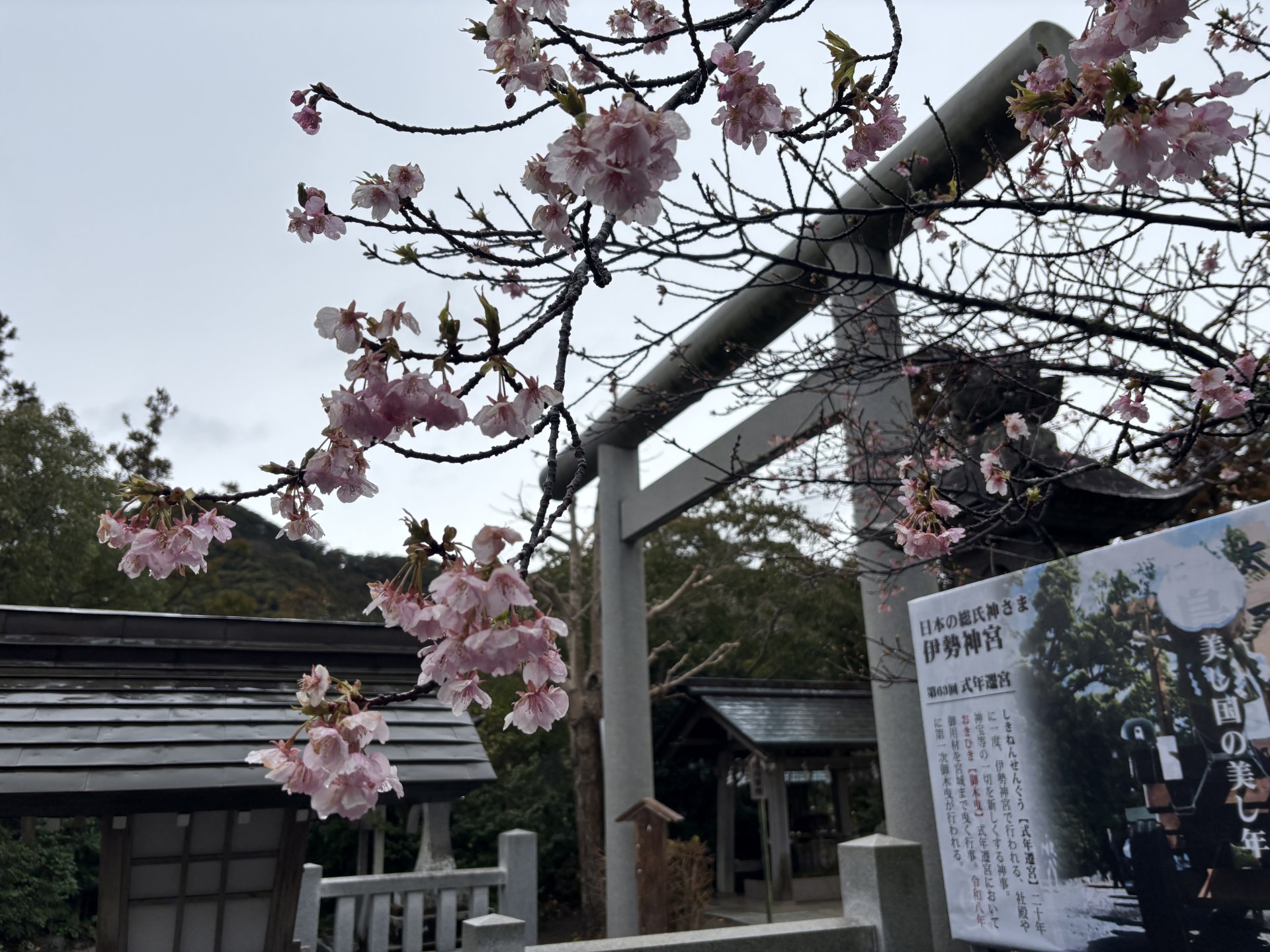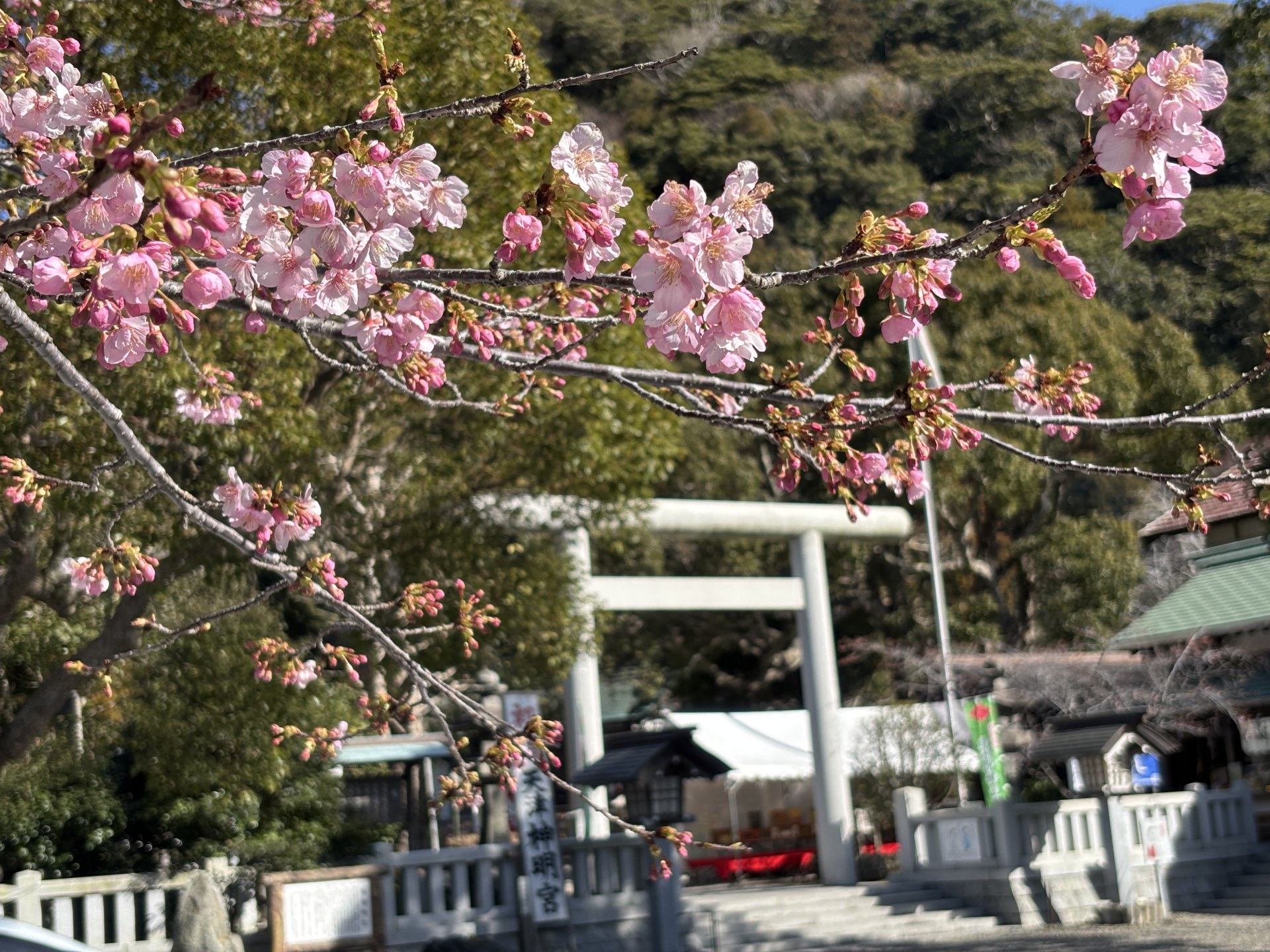 河津桜と鳥居を望む。 iPhone 15 5.96 mm ISO32 1/1080 sec f/1.6