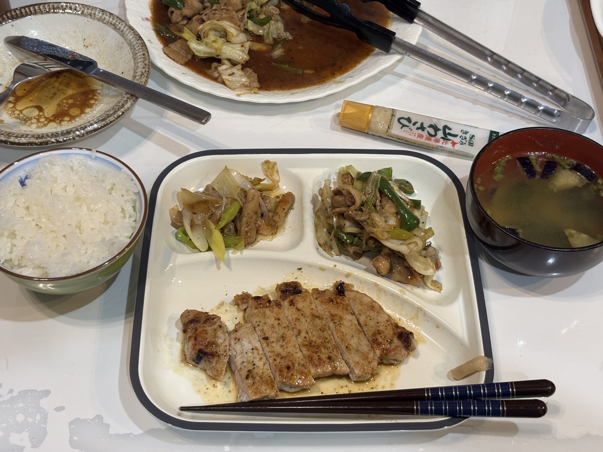 夕飯は私が担当。豚肉のソテーに回鍋肉、鶏皮焼きのネギポン酢和え…。なんか、偏ってる!?笑 iPhone 15 5.96 mm ISO100 1/50 sec f/1.6